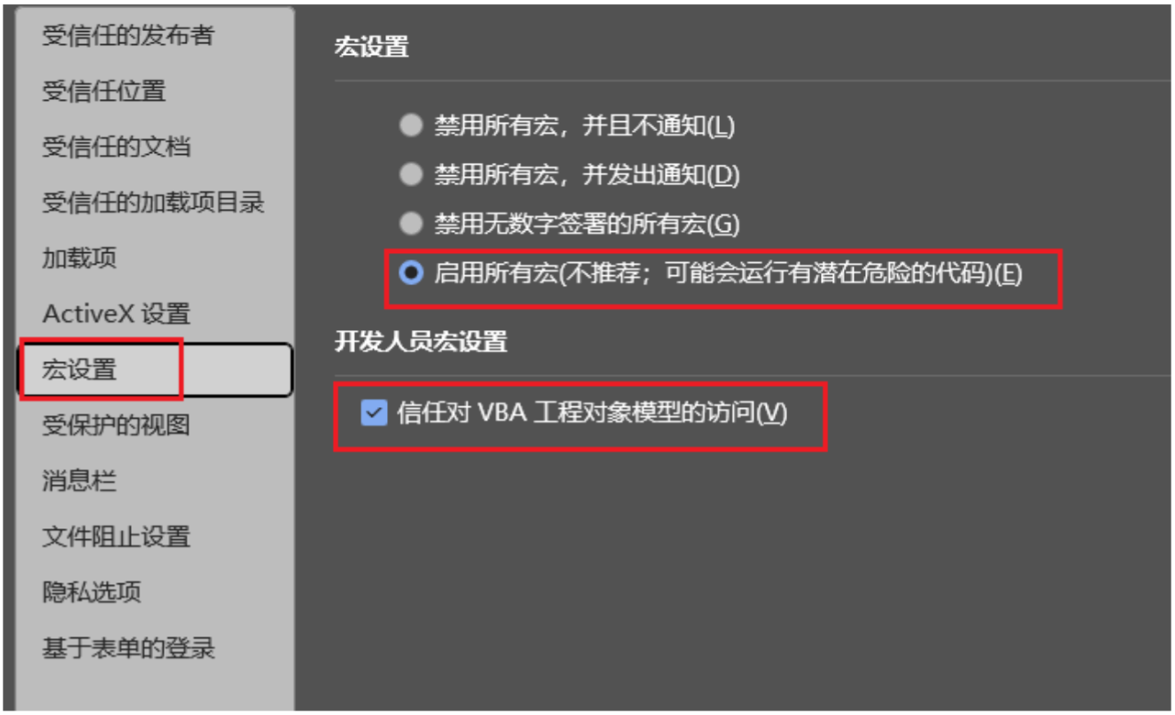 依次打开‘文件’-‘选项’-‘信任中心’-‘信任中心设置’-‘宏设置’,选择‘启用所有宏’,勾选‘信任对VBA工程对象模型的访问’
