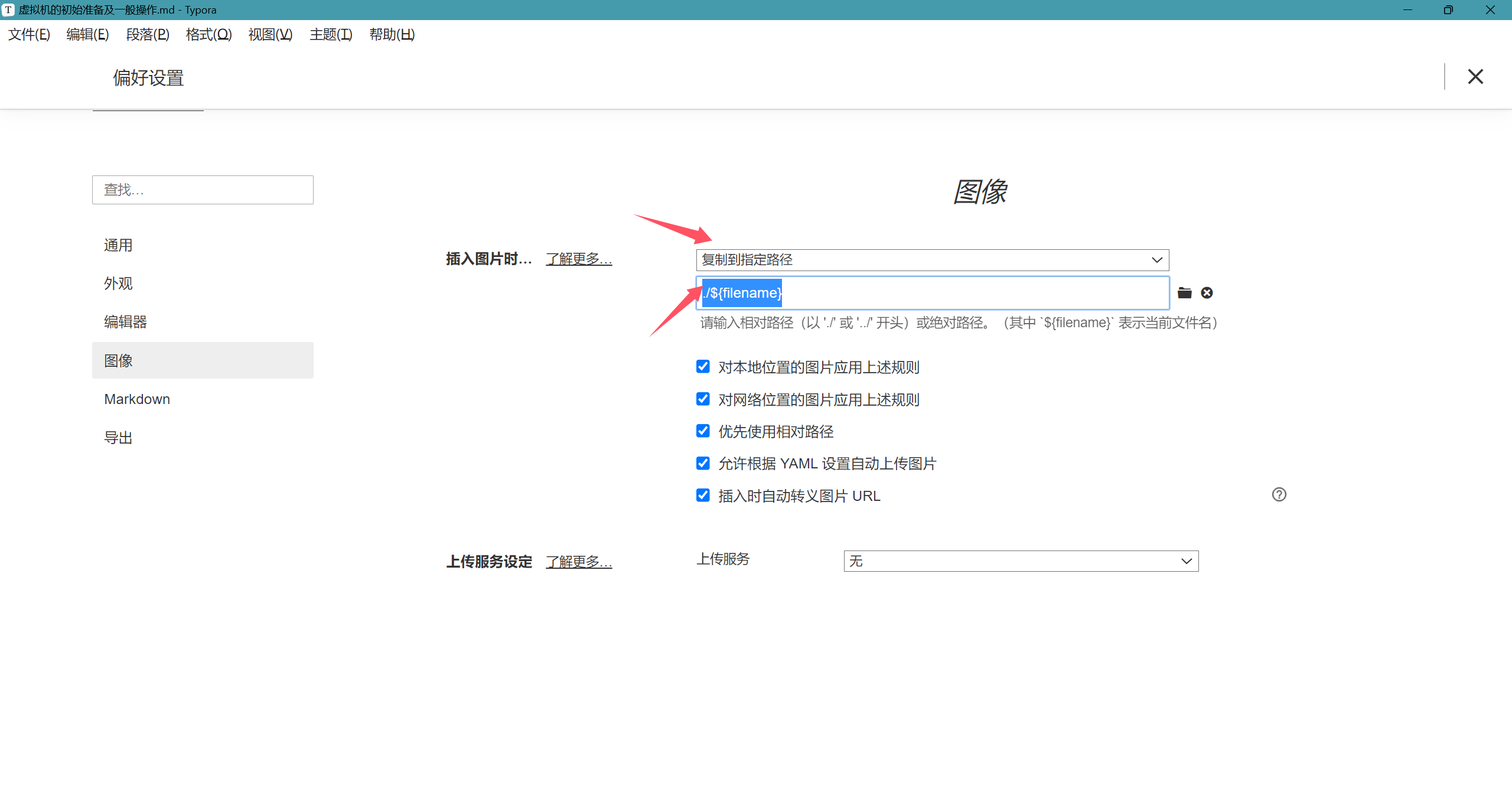 (4).md文件中的图片文件名称前不能带任何路径,要做到这一点,在我们编写.md文件时就要确保,如何确保呢,如果你使用的是Typora软件,在‘文件’-’偏好设置‘-’图像‘中,’插入图片时‘选择’复制到指定路径‘、’./${filename}‘