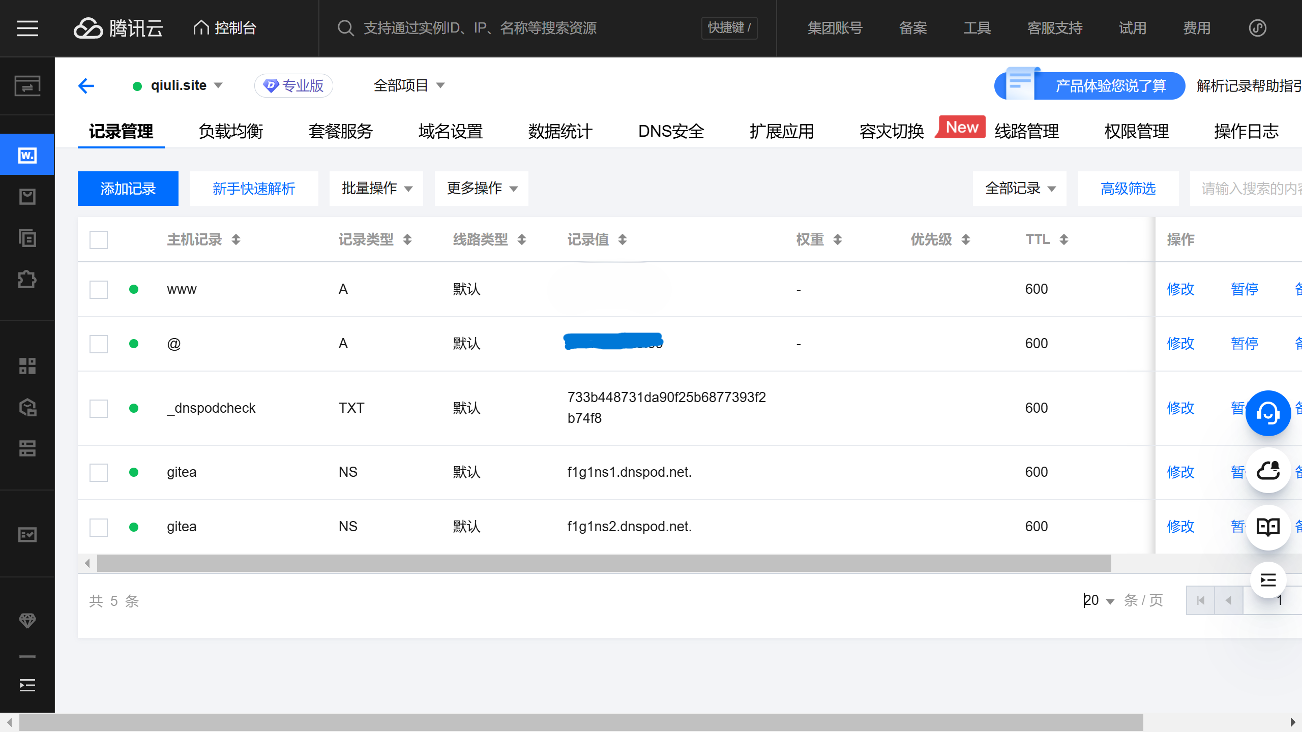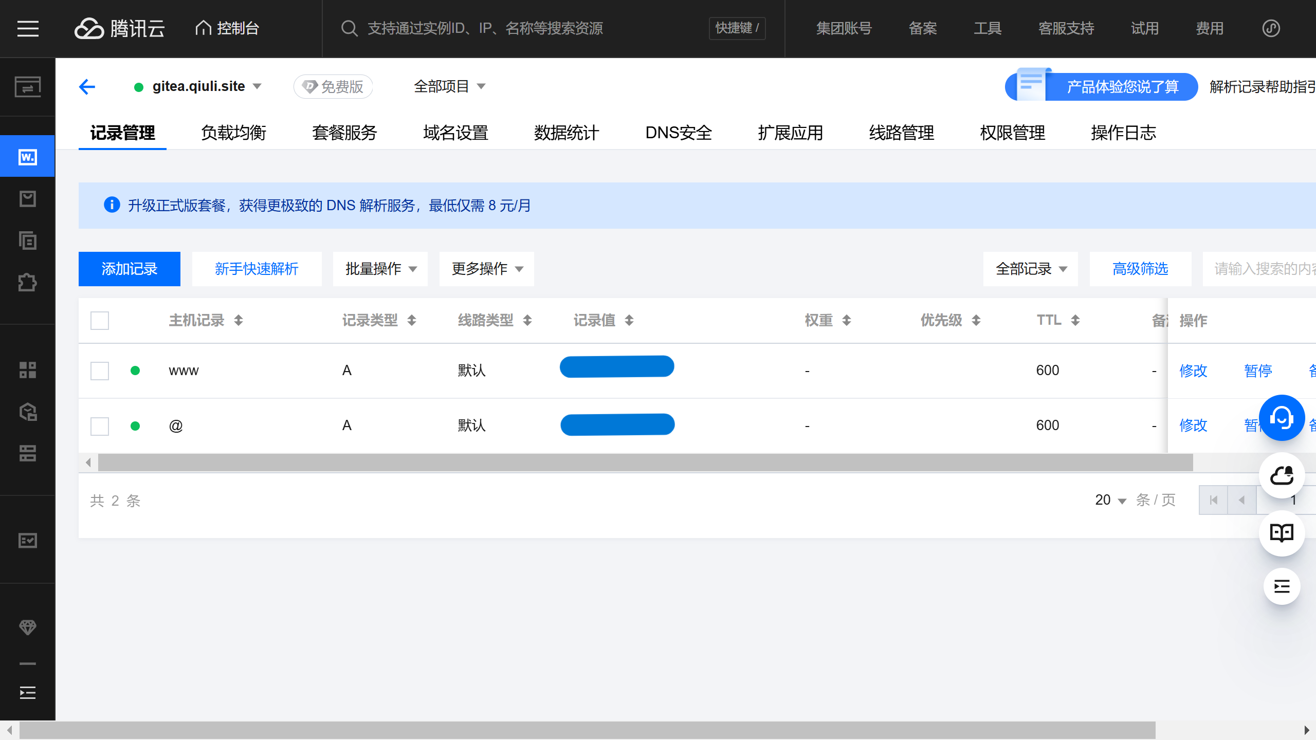 当我们完成域名备案后(我的域名:qiuli.site),就可以进行解析配置(这里可以购买云解析DNS,一般是和域名一起购买的,如果是使用腾讯的云服务器,这里可以不用购买),解析配置完成后就可以通过域名访问我们的云服务器